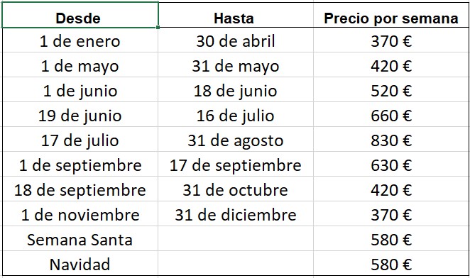 Estos precios son para una semana completa. Consulte precios para menos días. Existen descuentos para estancias superiores a una semana en función de la temporada.
